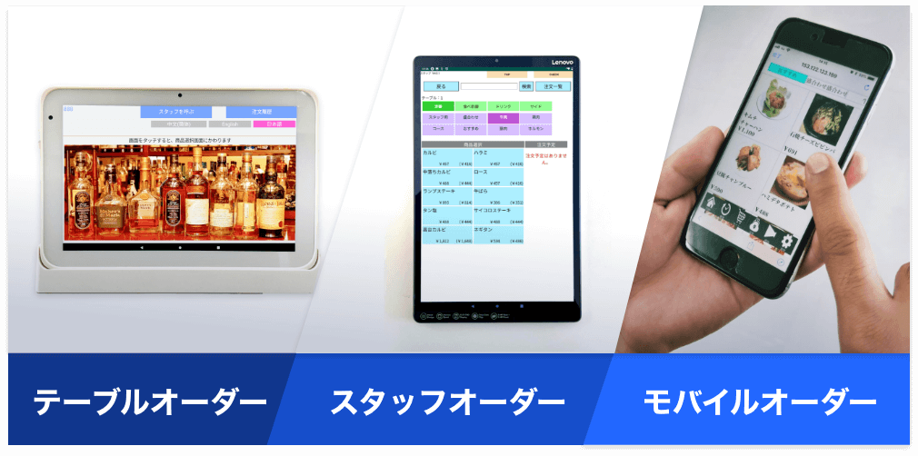 業態:定食・食堂でんちゅ~システム構成POSレジキッチンプリンタ × 1スタッフ用タブレット × 2セルフオーダータブレット × 20