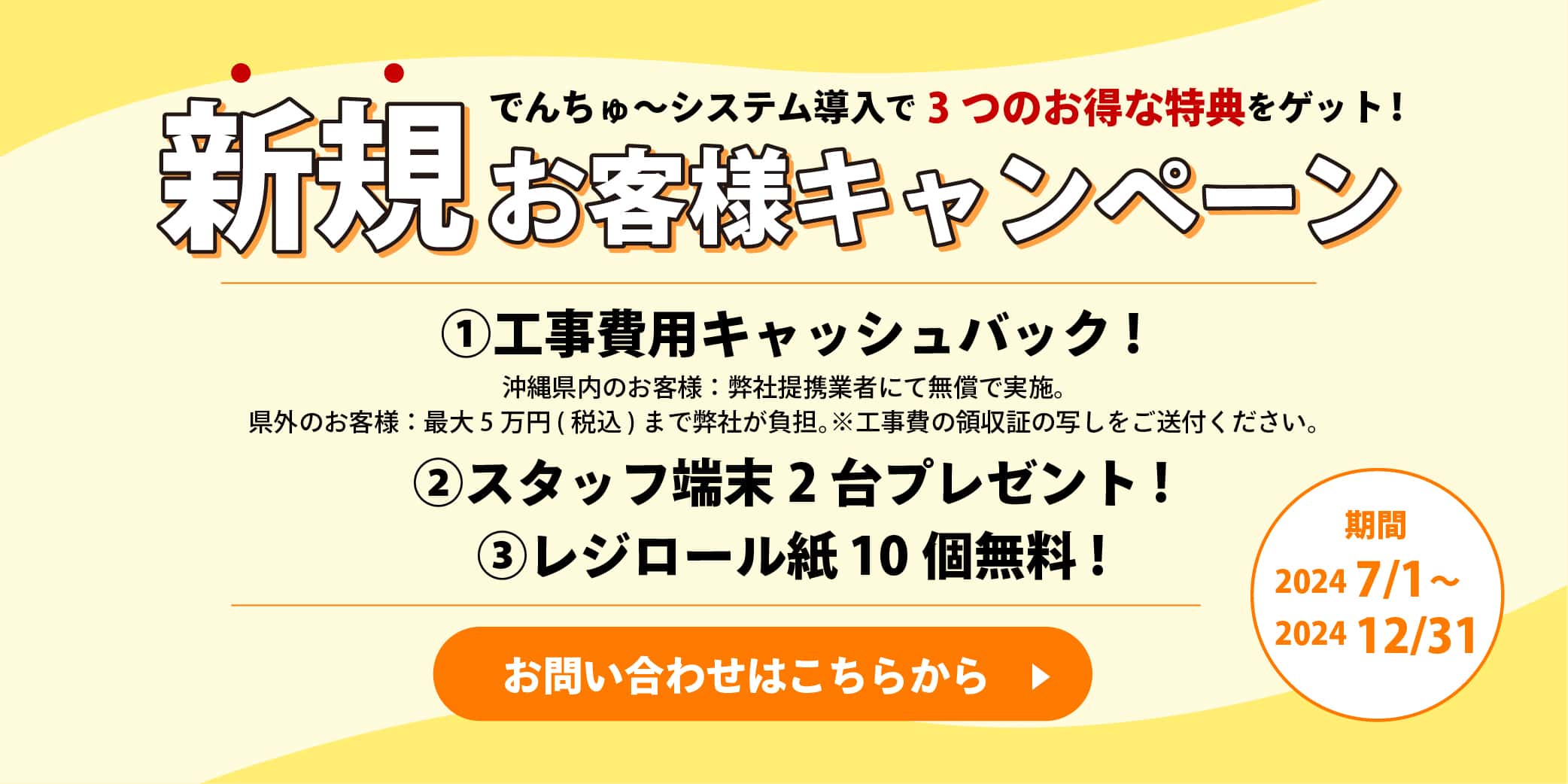 キャンペーン詳細1.工事費用キャッシュバック!2.スタッフ端末2台プレゼント!3.レジロール紙10個プレゼント!対象:新規ご契約店舗のみ詳しくはスタッフまでお問い合わせくださいTEL:098-943-5195https://dencyu.com/form/contact/